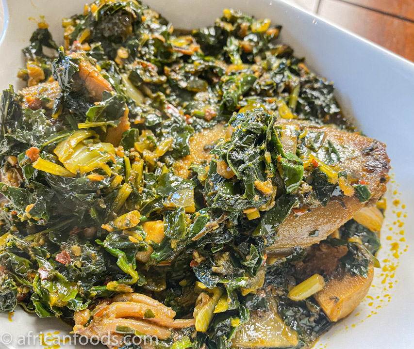 Edikangikong is very similar to its sister vegetable sauce from the same region, afang. They both use two vegetables. However, whereas, edikangikong's main veggies are waterleaf and ugu, afang is okazi and waterleaf os spinach. Check out recipe here.